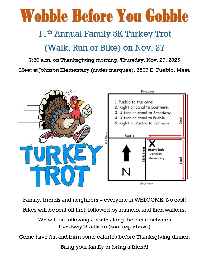 Join us for our stake’s annual Wobble Before You Gobble Turkey Trot (walk, run or bike) starting at 7:30 a.m. Thanksgiving morning, Thursday, Nov. 27.